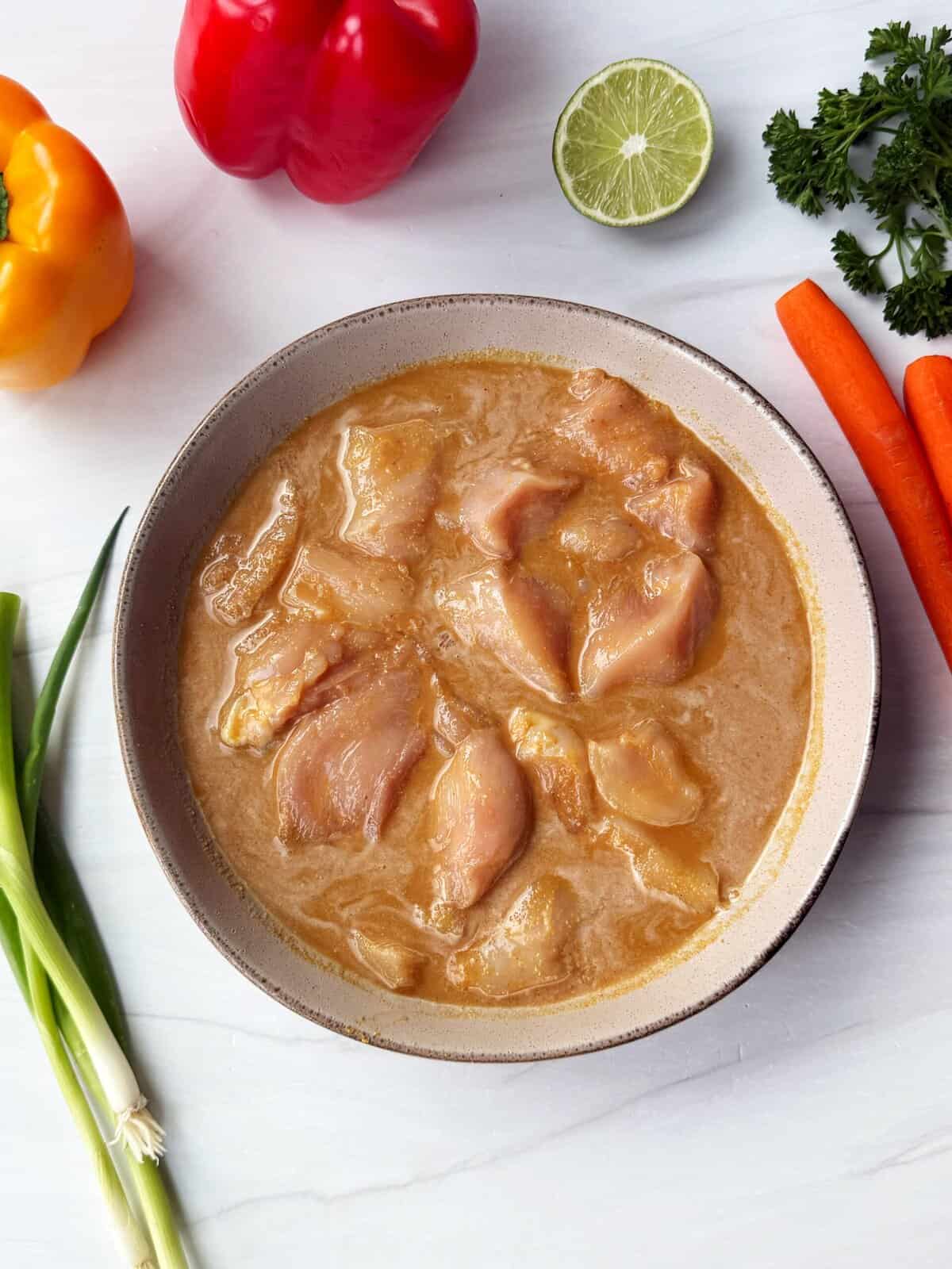 - Add in cubed chicken and marinate for about 30 minutes in the refrigerator.