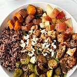 Step 7: Assemble bowl with a base of arugula and add rice, sweet potatoes, brussels sprouts, apples, chicken, cheese and nuts on top. Drizzle with dressing and enjoy!