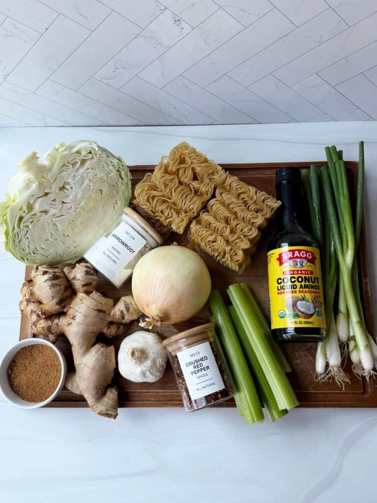 Step 1: Gather all ingredients and prep vegetables by chopping the onion, cabbage and celery and mincing the garlic.