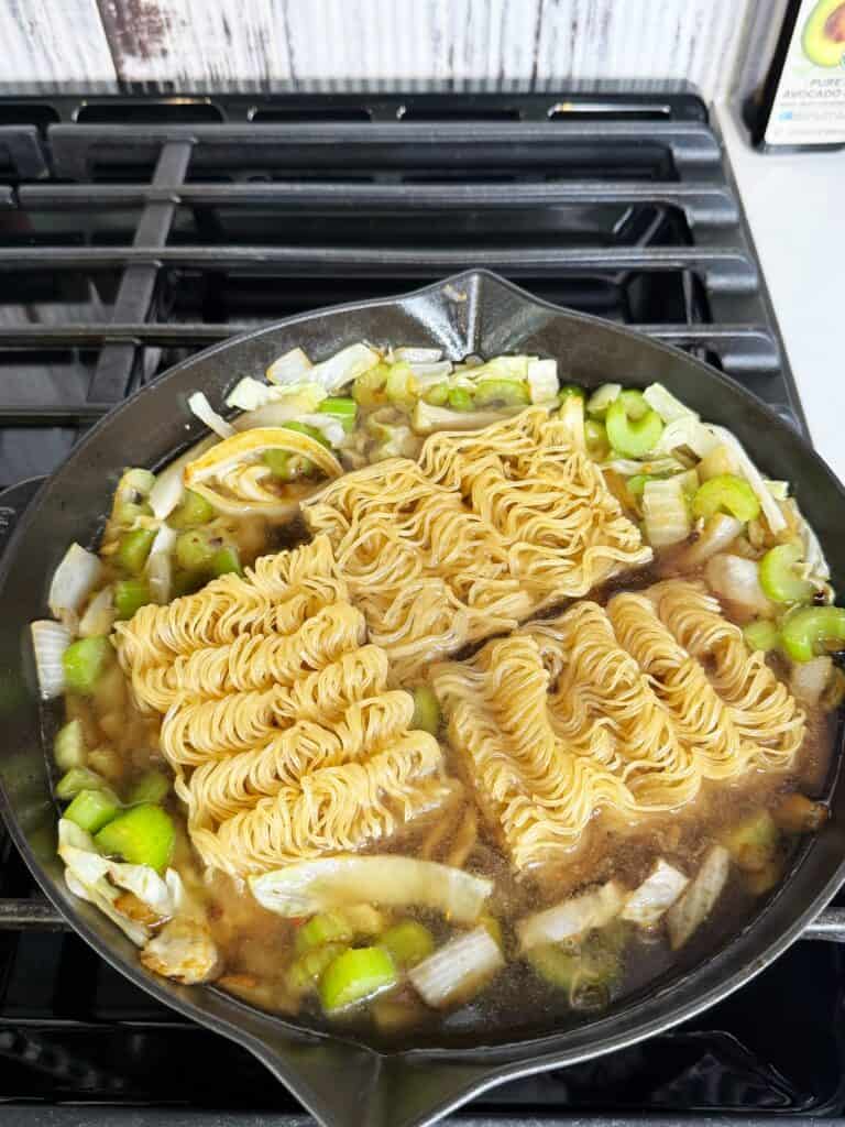 Step 5: Pour the sauce into the pan with vegetables and add the ramen cakes.