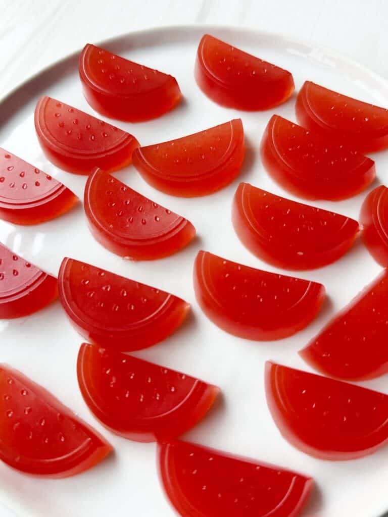I store my Watermelon Gummies in an airtight container in the refrigerator for 7 to 10 days. A great trick is to lightly dust the gummies with cornstarch or arrowroot powder before storing to prevent them from sticking together. Trust me on this one!