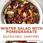 This Winter Salad with Pomegranate is the perfect bright and nourishing lunch or dinner option! It has the perfect texture from the crunchy pecans, crispy apples, creamy avocado and crisp lettuce! The homemade 4 ingredient honey lemon dressing really ties the flavors together. The best part is that once the components are roasted, this salad only takes a few minutes to throw together!